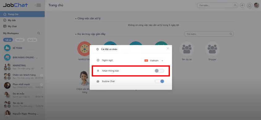 Tính năng thông báo Jobchat đã trở thành cánh tay đắc lực cho các cá nhân, doanh nghiệp hoàn thành công việc của mình đúng tiến độ. Với tính năng này, có thể thông báo cho bạn khi có bất cứ nội dung gì. Bật ngay thông báo để làm việc chuyên nghiệp hơn nào.